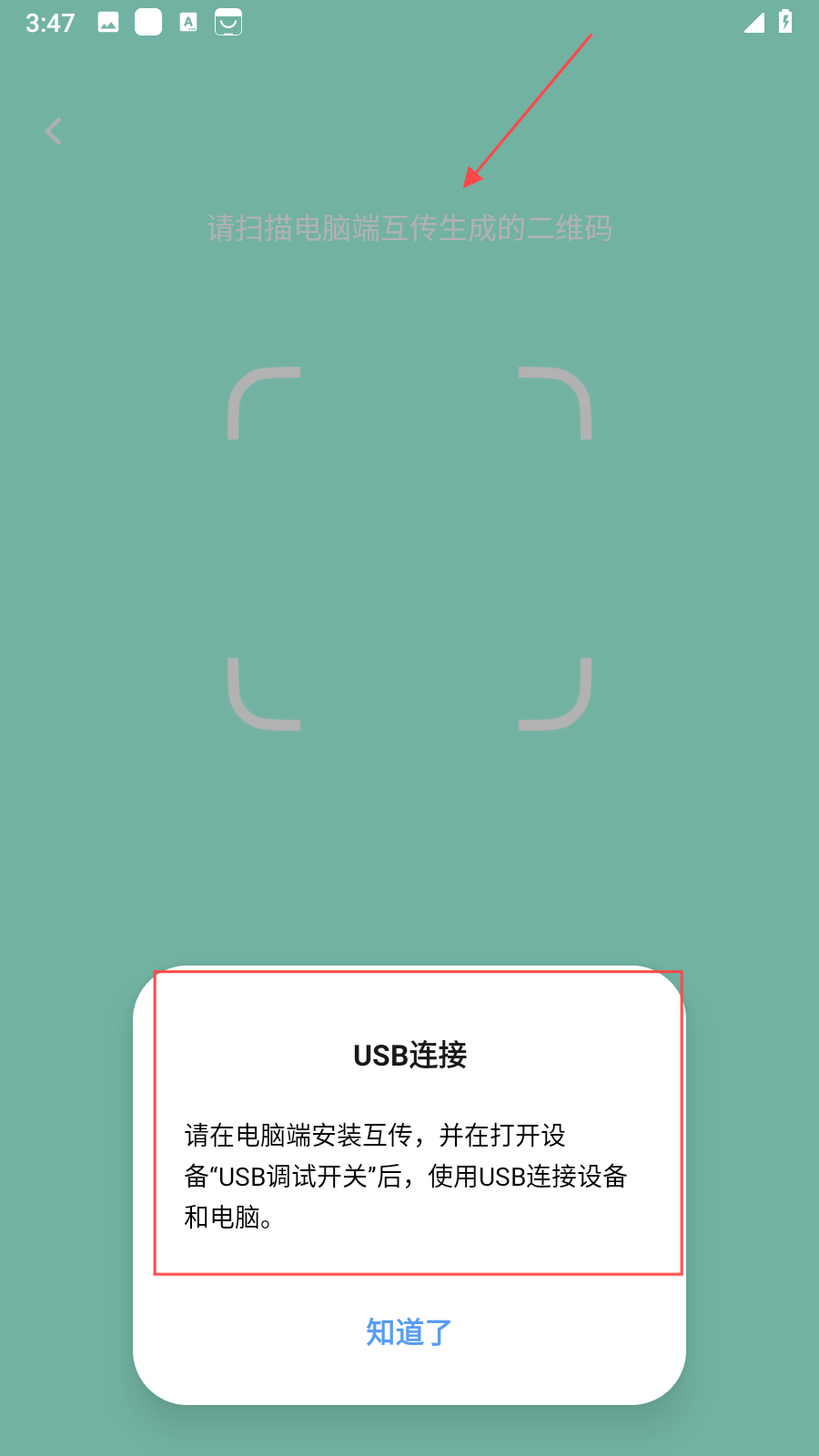3、打開電腦端的互傳應用,在手機端互傳中,出現(xiàn)掃描界面后,掃描電腦端互傳生成的二維碼,建立連接,也可以使用USB數(shù)據(jù)線連接手機和電腦,按照提示選擇要備份的數(shù)據(jù)。