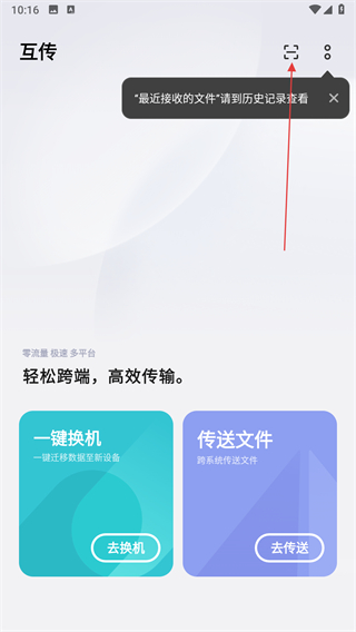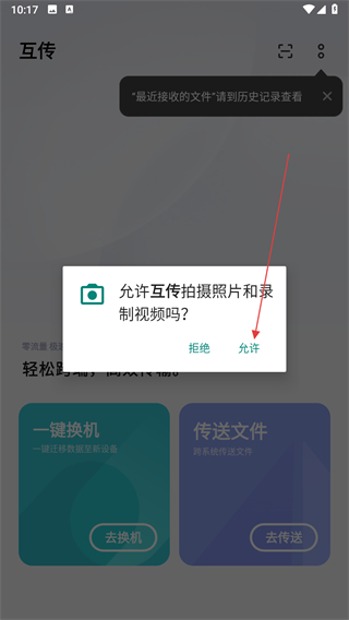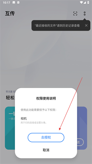 1、打開互傳應用,點擊二維碼圖標,彈出權(quán)限使用說明彈窗。