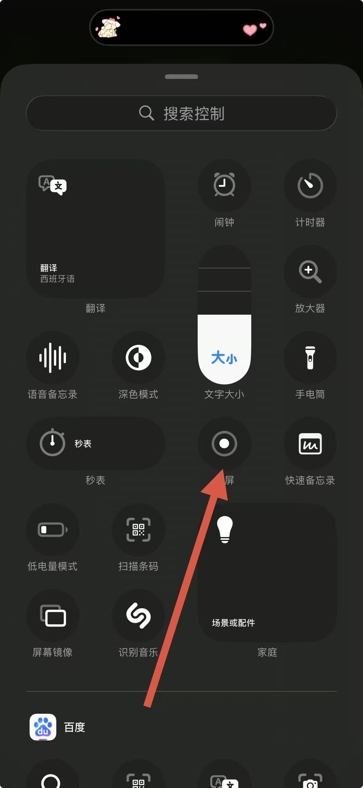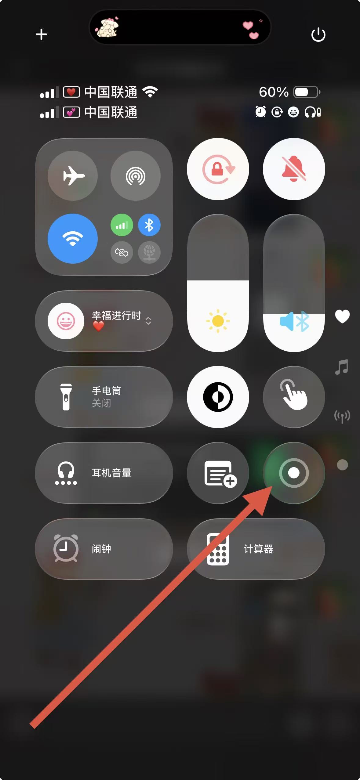 3、添加完成后,返回控制中心,即可看到錄屏功能已添加其中,點(diǎn)擊錄屏按鈕。