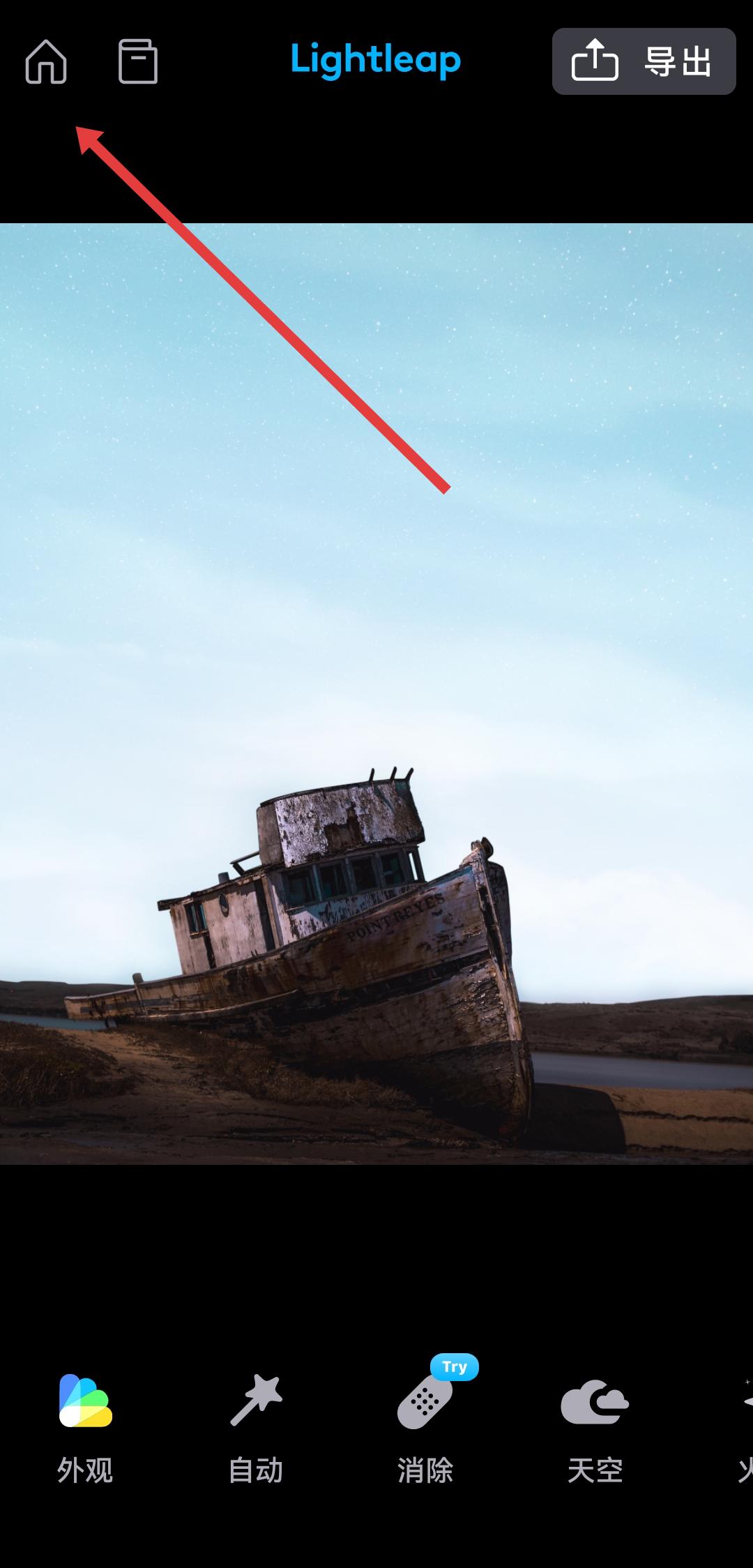 3、照片導(dǎo)入后,進(jìn)入Lightleap的編輯界面,可使用底部功能對(duì)照片進(jìn)行編輯。
