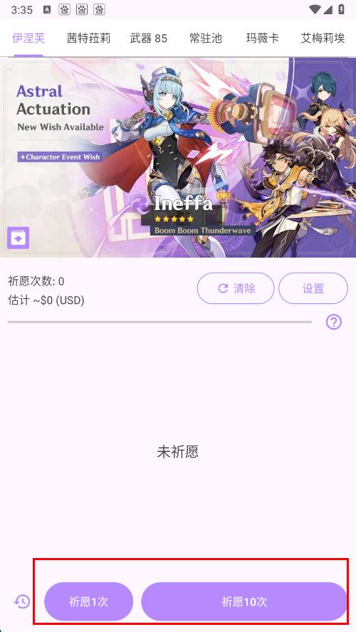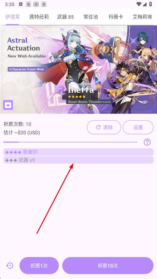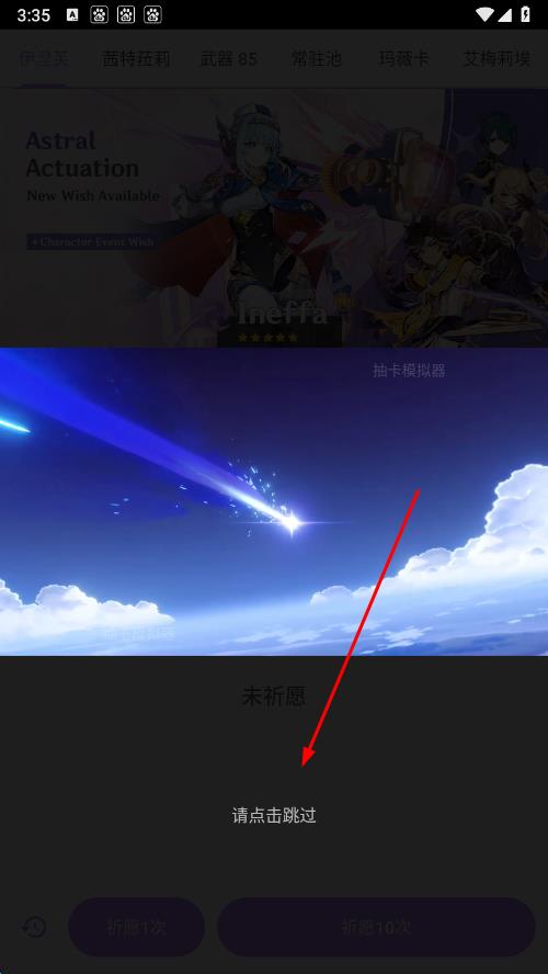 1、進(jìn)入抽卡模擬器界面,在界面下方找到祈愿1次或祈愿10次按鈕,點(diǎn)擊按鈕。