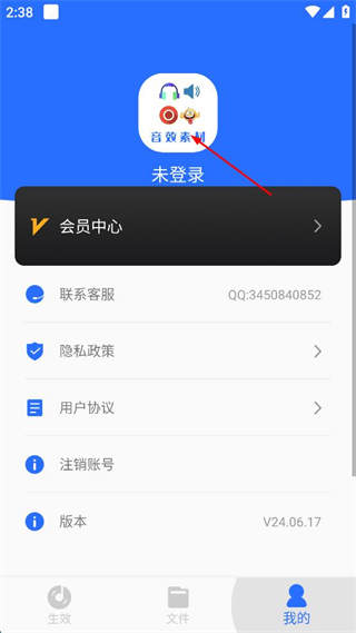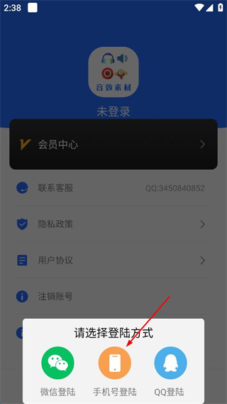 2、在個(gè)人中心界面,點(diǎn)擊“音效素材”未登錄區(qū)域,彈出登錄方式選擇彈窗。