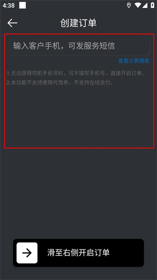 4、在創(chuàng)建訂單頁面,輸入客戶手機(jī),滑至右側(cè)開啟訂單即可創(chuàng)建代駕訂單。