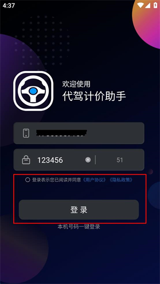 1、打開代駕計價助手APP,輸入手機(jī)號碼,點(diǎn)擊獲取驗(yàn)證碼并輸入驗(yàn)證碼。