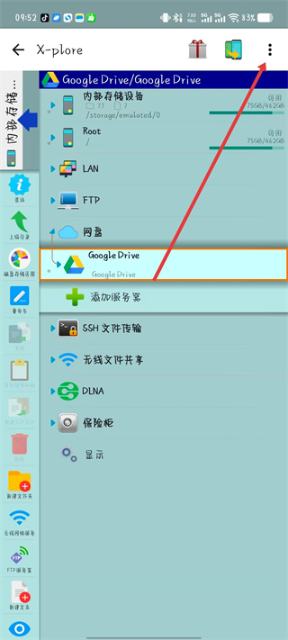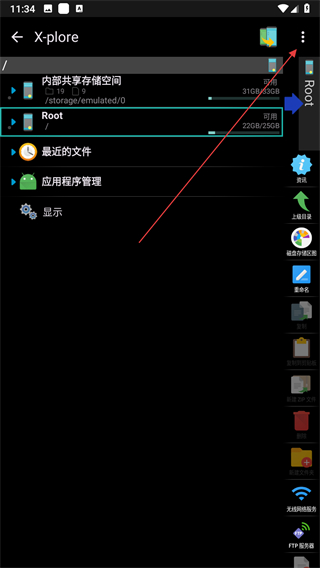 1、打開(kāi)X-plore文件管理器,點(diǎn)擊界面右上角的三點(diǎn)菜單圖標(biāo)。