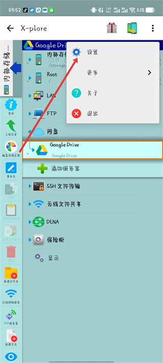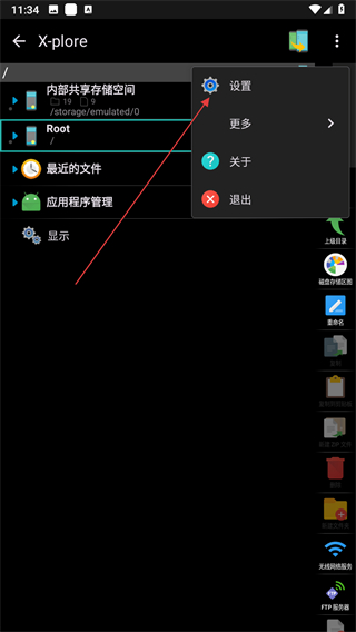 2、在展開(kāi)的菜單中,點(diǎn)擊設(shè)置選項(xiàng),進(jìn)入X-plore的設(shè)置頁(yè)面。