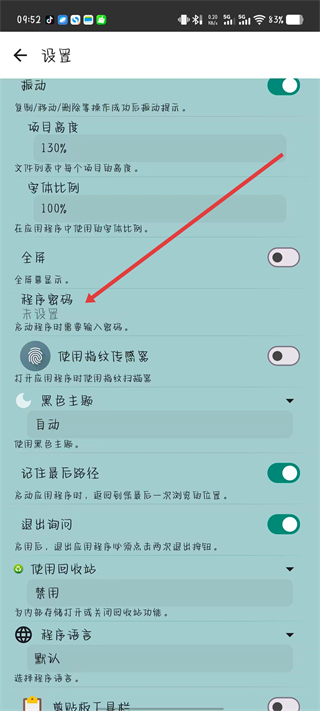3、在設(shè)置頁(yè)面,點(diǎn)擊程序密碼選項(xiàng)。