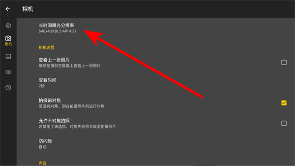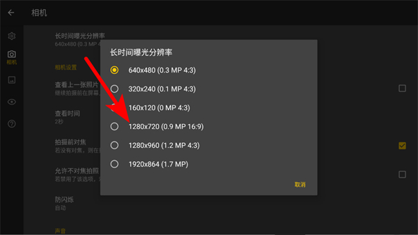 2、進(jìn)入相機(jī)設(shè)置頁面后,點(diǎn)擊長時間曝光分辨率選項(xiàng)。