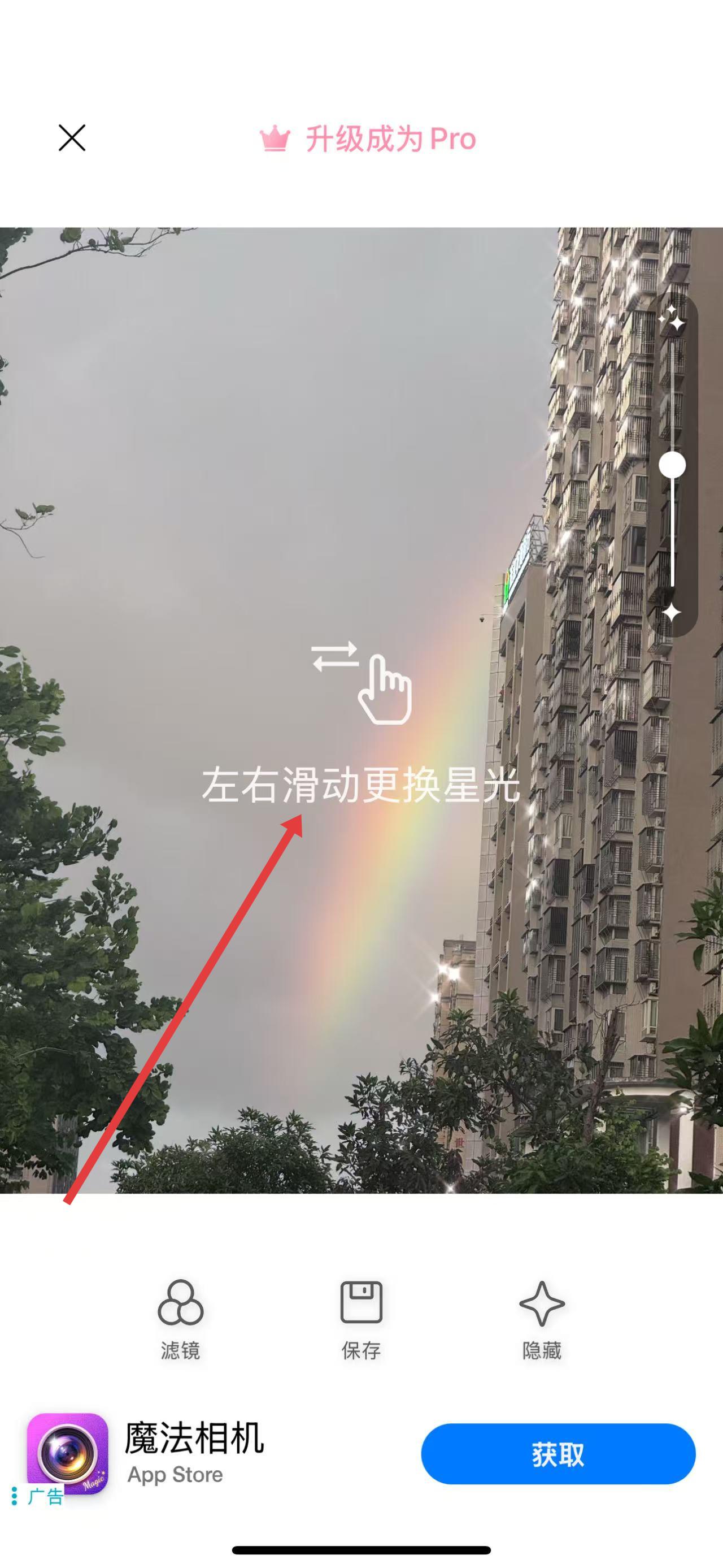 3、在照片編輯界面,按照提示左右滑動(dòng)屏幕,即可更換和添加亮晶晶星光效果。