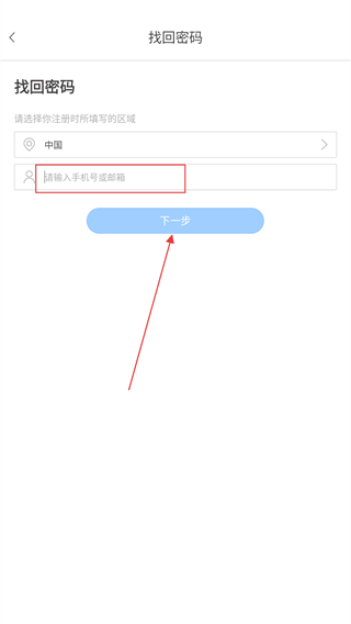 2、進入找回密碼的頁面內(nèi),輸入手機號或郵箱,再點擊下一步。