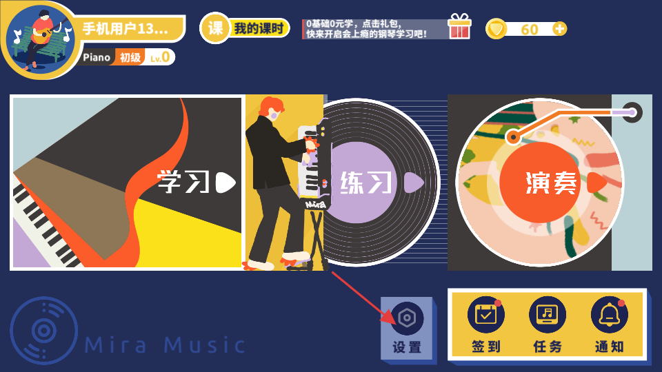 1、打開迷鹿吉他鋼琴尤克app,在主界面中點擊下方的設(shè)置按鈕。
