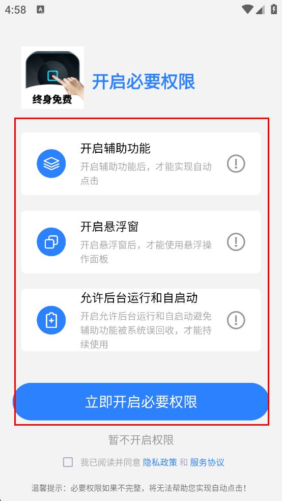 2、進(jìn)入開(kāi)啟必要權(quán)限頁(yè)面,依次開(kāi)啟輔助功能、懸浮窗以及允許后臺(tái)運(yùn)行和自啟動(dòng)權(quán)限,然后勾選我已閱讀并同意隱私政策和服務(wù)協(xié)議。