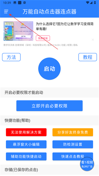1、打開(kāi)萬(wàn)能自動(dòng)點(diǎn)擊器連點(diǎn)器,點(diǎn)擊三條橫線菜單。