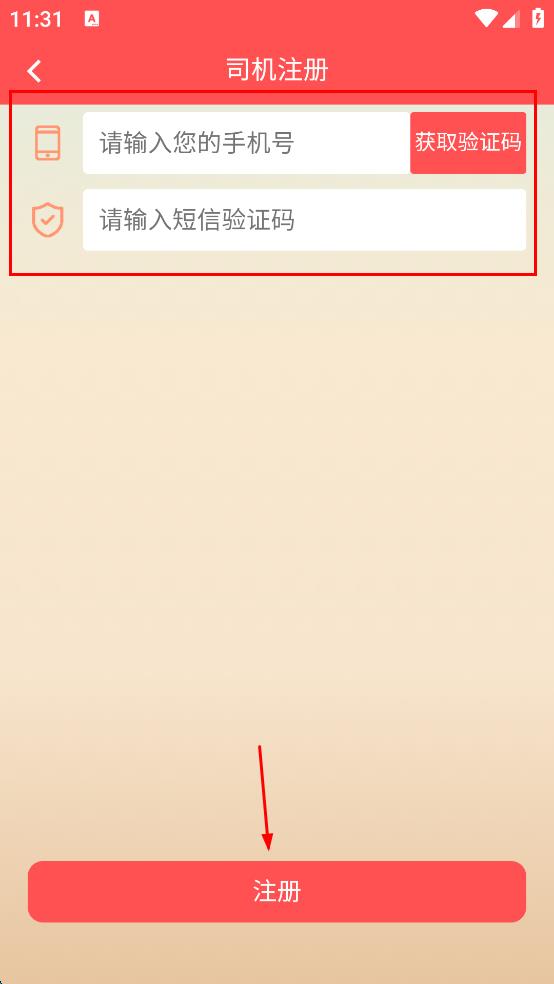 4、待收到短信驗證碼后,在“請輸入短信驗證碼”輸入框中輸入驗證碼,輸入完成后點擊“注冊”按鈕,完成三寧物流APP的司機注冊操作。