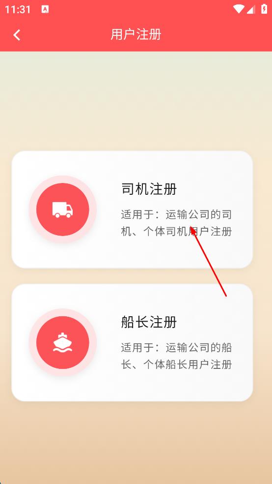2、在個人相關(guān)頁面,點擊“新用戶注冊”選項,進入用戶注冊頁面,頁面有“司機注冊”和“船長注冊”兩個選項。