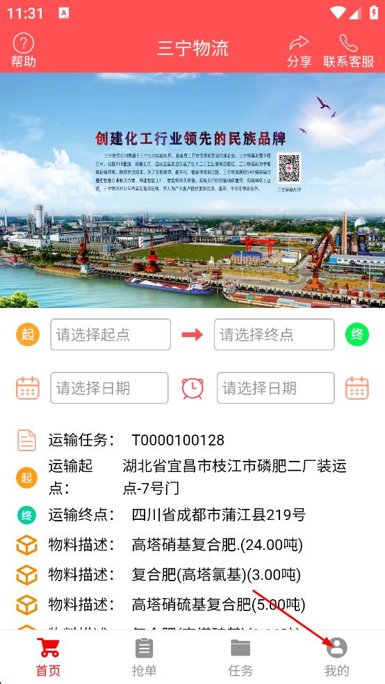 1、打開三寧物流APP,進入首頁后,點擊右下角的“我的”選項,進入個人相關(guān)頁面,頁面有“請輸入手機號”“密碼”等輸入框,還有“新用戶注冊”選項。