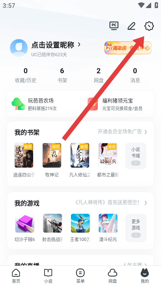 1、進入UC瀏覽器我的頁面,點擊右上角齒輪狀設(shè)置的圖標(biāo),開啟恢復(fù)歷史記錄的操作流程。