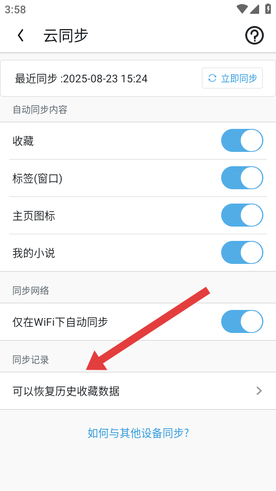 3、在云同步頁面內(nèi),點擊可以恢復(fù)歷史收藏數(shù)據(jù)的選項,即可嘗試恢復(fù)已刪除的瀏覽歷史數(shù)據(jù)。