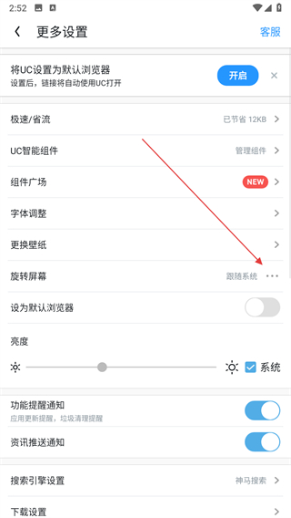 3、找到旋轉(zhuǎn)屏幕選項,點擊其右側(cè)的三個點按鈕,彈出選擇菜單。