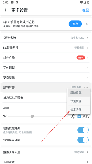 4、在菜單中選擇鎖定豎屏選項,即可將UC瀏覽器鎖定為豎屏模式。