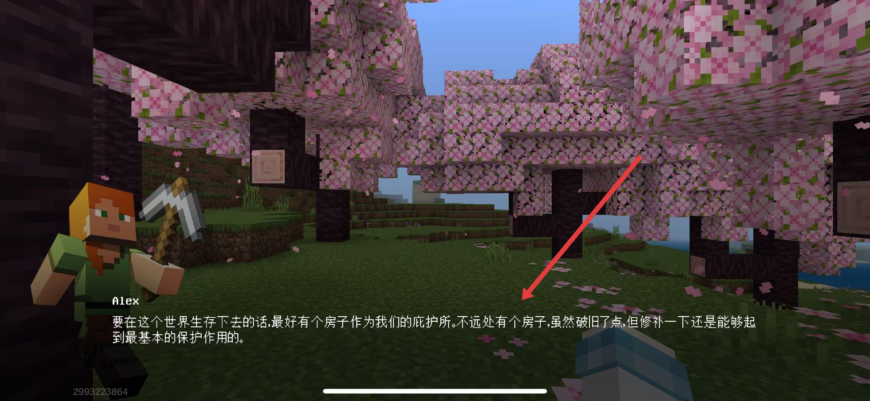 1、畫面中角色Alex提示需找庇護所,按指引朝箭頭方向前進,可找到破舊房子,后續(xù)可修補用作生存庇護所。