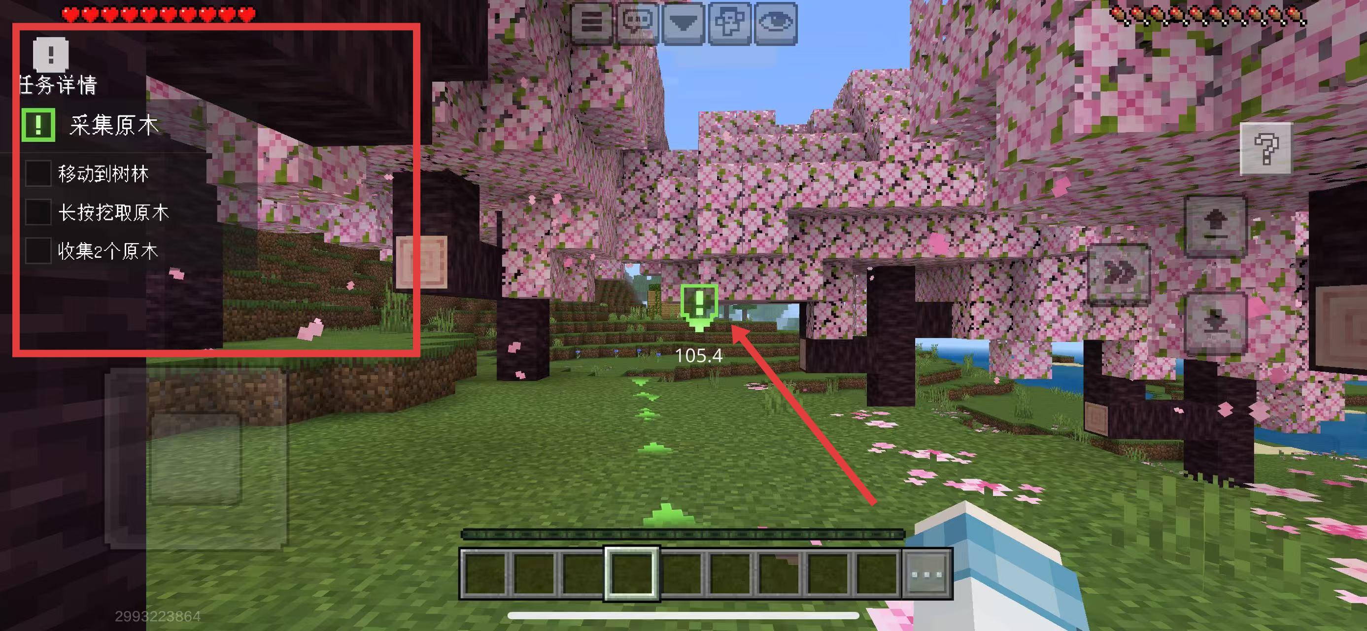 2、左側(cè)任務(wù)詳情顯示采集原木任務(wù),需移動到樹林綠色感嘆號處,按提示前往完成移動到樹林步驟。