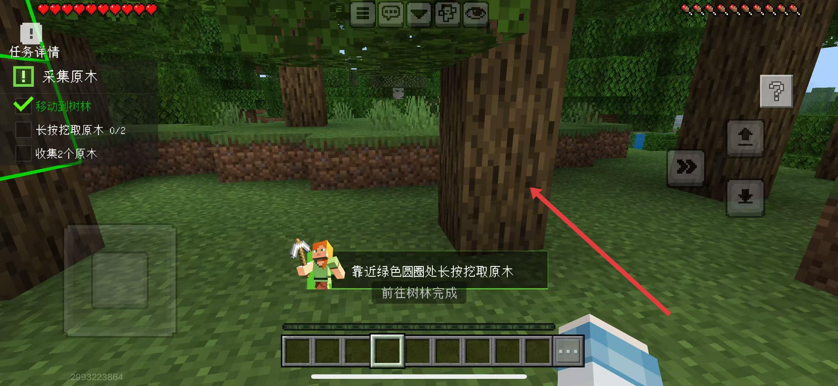 3、到達樹林后,靠近樹木,按提示長按挖取原木,需收集2個原木,完成長按挖取原木、收集2個原木任務(wù)環(huán)節(jié)。