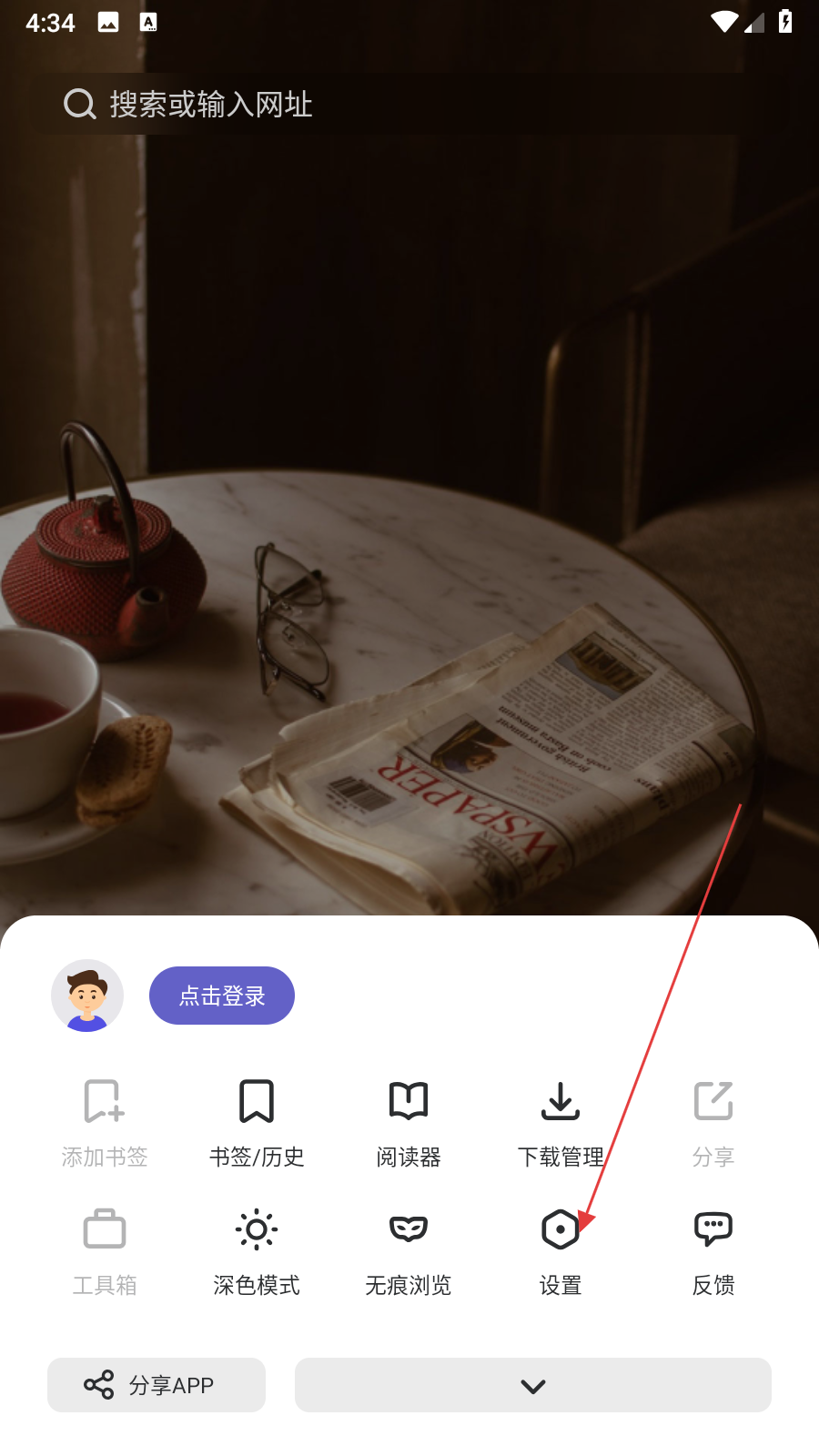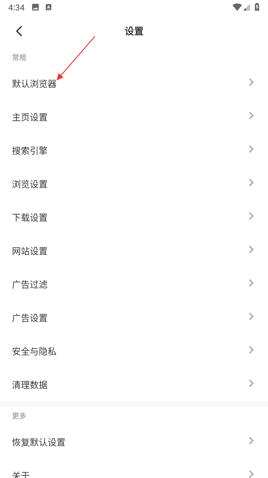 3、在設(shè)置頁面中,點擊默認瀏覽器選項,進入瀏覽器應(yīng)用的選擇界面。