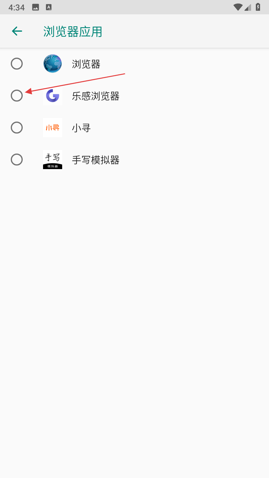 4、在瀏覽器應(yīng)用選擇界面,找到樂感瀏覽器對應(yīng)的單選按鈕并點擊,完成默認瀏覽器的設(shè)置。