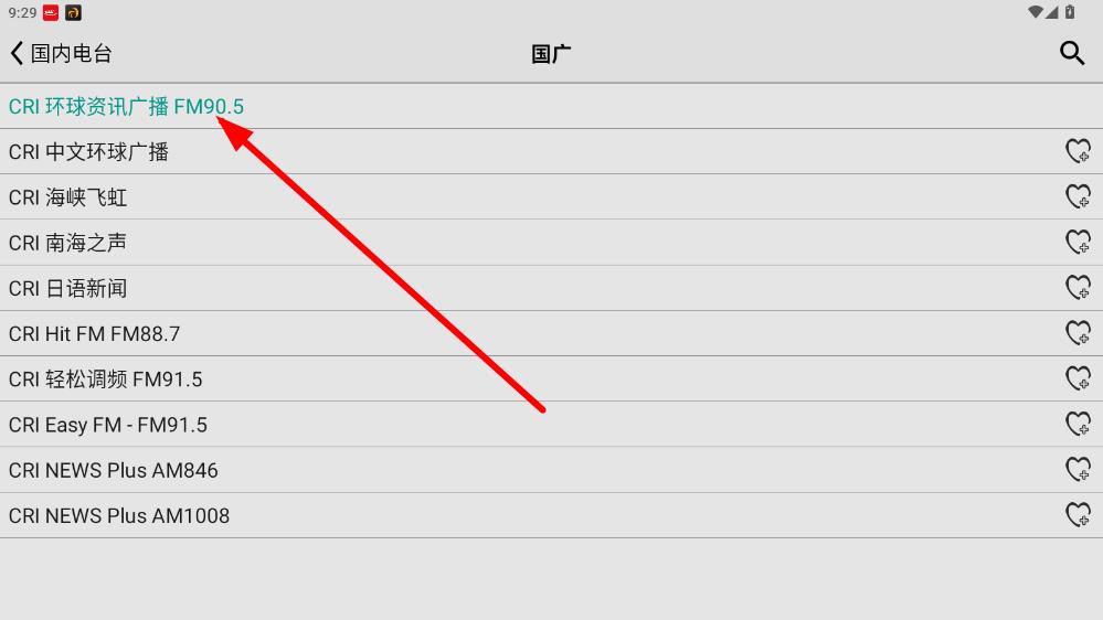 3、在國(guó)廣電臺(tái)列表中,選擇想要播放的電臺(tái)如CRI環(huán)球資訊廣播FM90.5并點(diǎn)擊。