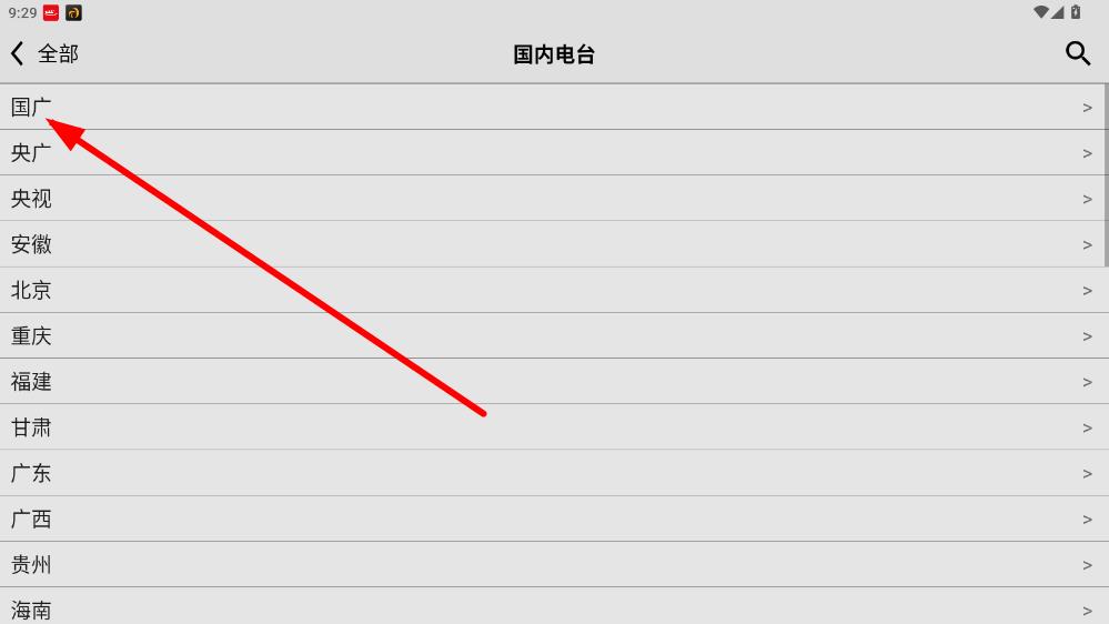 2、在國(guó)內(nèi)電臺(tái)分類頁(yè)面里,點(diǎn)擊國(guó)廣選項(xiàng)進(jìn)入國(guó)廣電臺(tái)列表。