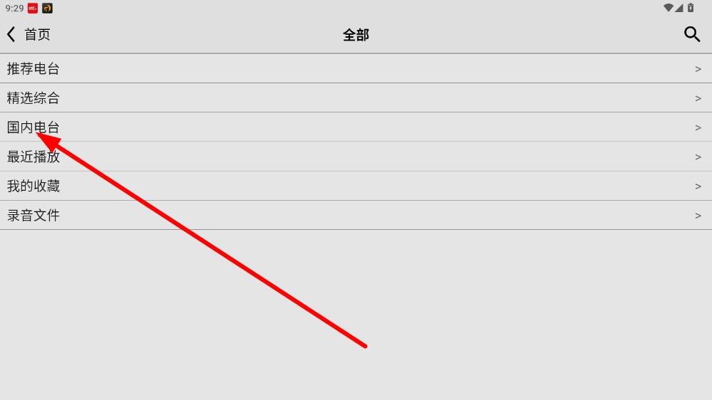 1、打開(kāi)龍卷風(fēng)收音機(jī)進(jìn)入首頁(yè),在電臺(tái)列表界面中,點(diǎn)擊國(guó)內(nèi)電臺(tái)選項(xiàng)進(jìn)入國(guó)內(nèi)電臺(tái)分類頁(yè)面。