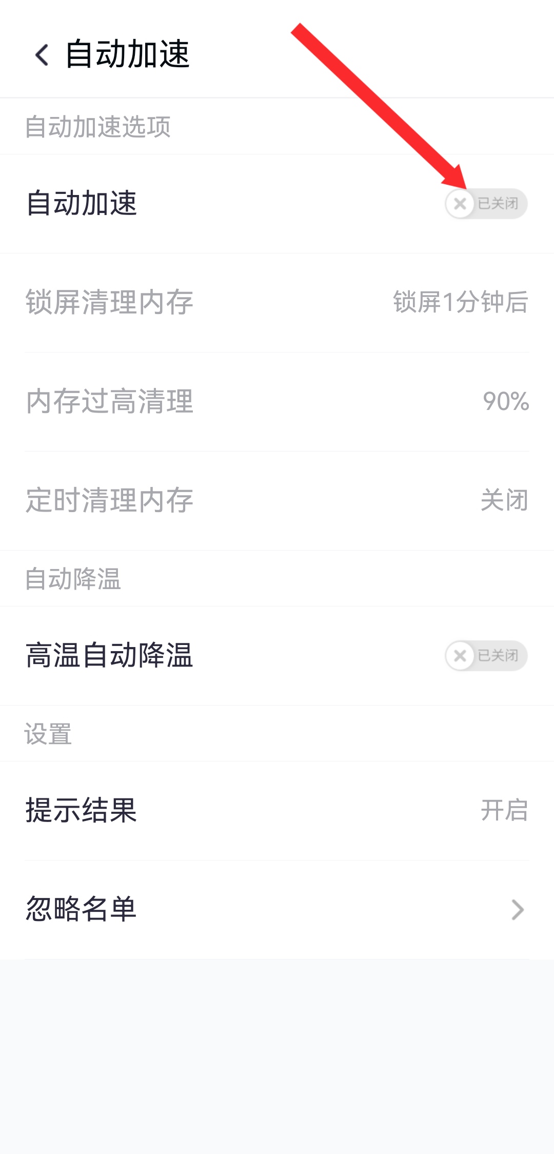 4、在自動(dòng)加速設(shè)置頁面,開啟自動(dòng)加速的開關(guān),完成功能開啟。