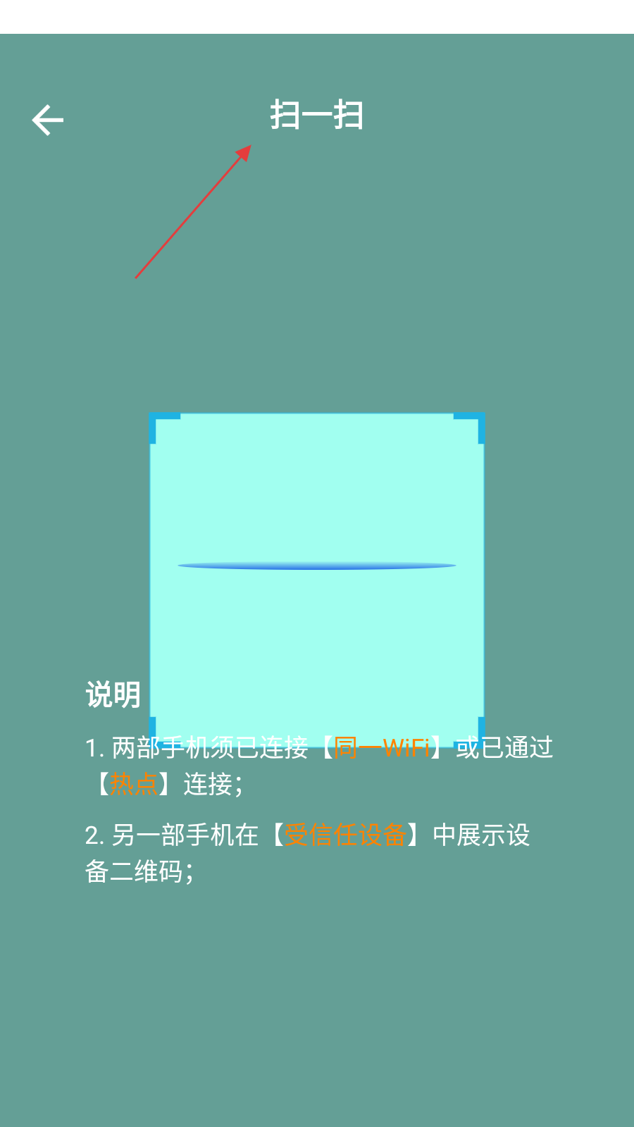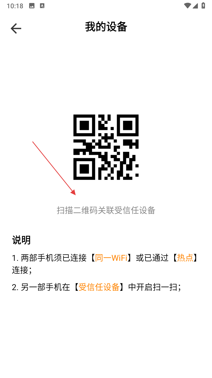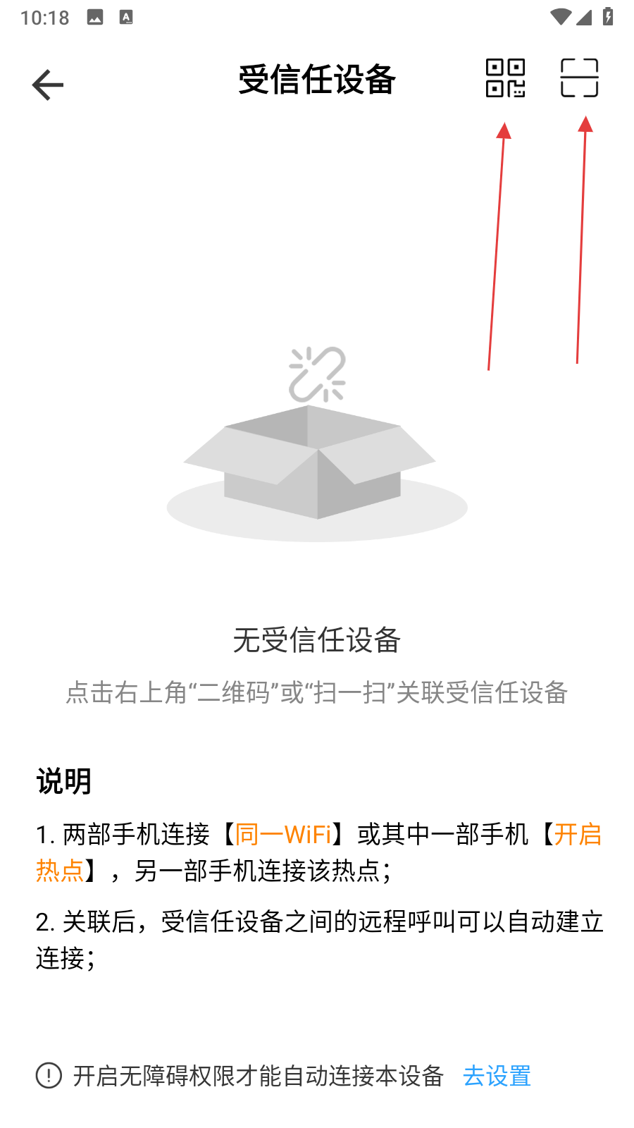 2、在受信任設備管理界面,有兩種連接方式,右上角的二維碼或者掃一掃。