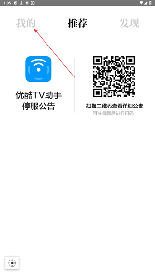 1、啟動優(yōu)酷t(yī)v助手APP,在首頁推薦左側(cè)點擊我的功能。
