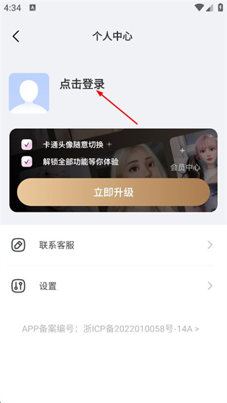 1、打開卡通相機APP,點擊頁面右上角個人中心圖標。