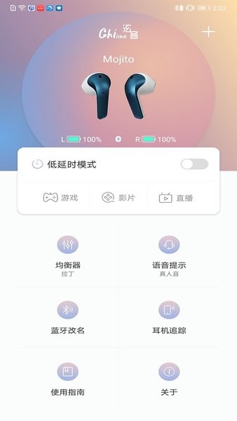 與chiline泫音耳機藍(lán)牙配對后,用戶可對耳機進行一系列操控。支持藍(lán)牙耳機改名,顯示耳機的藍(lán)牙連接狀態(tài)、顯示耳機的左右耳電量,用戶可進行音效切換和定制!