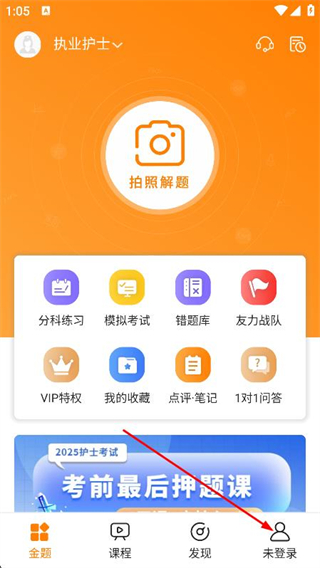1、打開金題護考,點擊底部導航欄的未登錄。