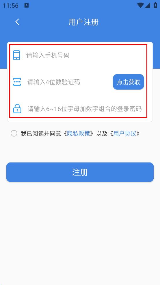 3、在用戶注冊頁面,輸入手機號碼,點擊獲取驗證碼,輸入驗證碼,再設(shè)置符合要求的登錄密碼。