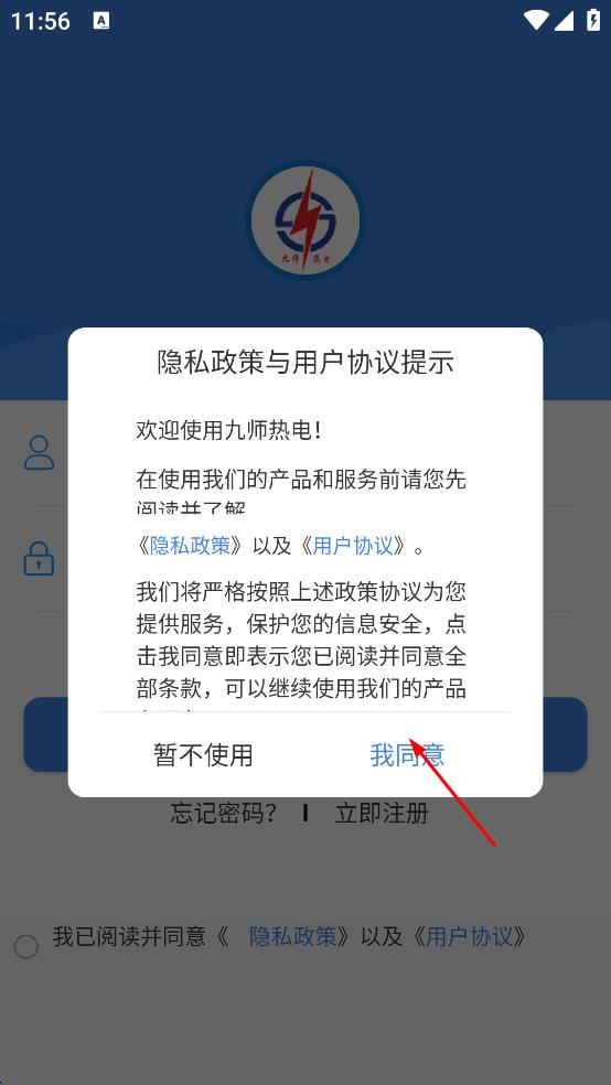 1、打開九師熱電,在彈出的隱私政策與用戶協(xié)議提示頁面,點擊我同意,進入登錄頁面。
