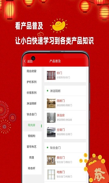 -產(chǎn)品普及,您可以通過線上導(dǎo)購師快速學(xué)習(xí)到門窗知識,還可以在“產(chǎn)品普及”頁面瀏覽上架的無數(shù)產(chǎn)品,認識各類產(chǎn)品及特點,封窗靈感一觸即發(fā)。