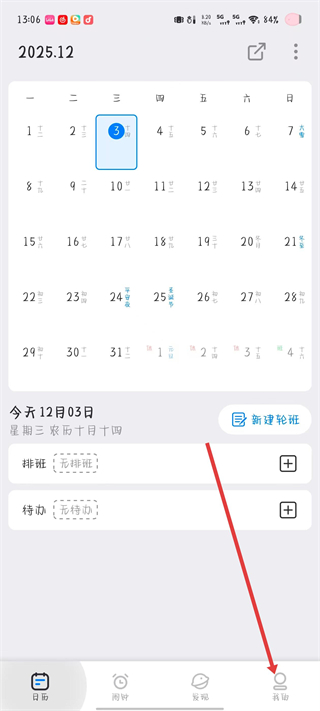 1、打開排班助手應(yīng)用,進(jìn)入日歷頁(yè)面后,點(diǎn)擊底部導(dǎo)航欄的我的選項(xiàng)。