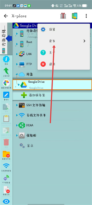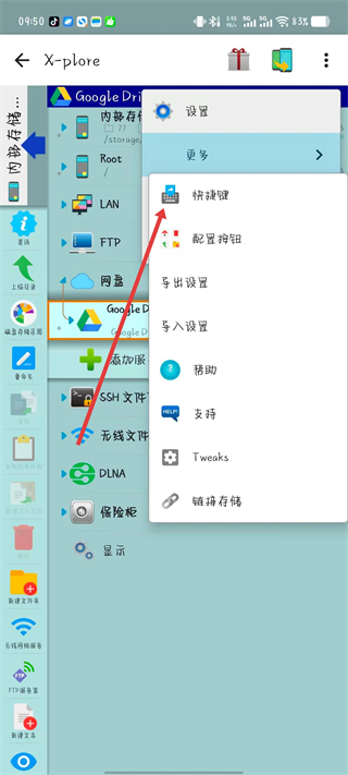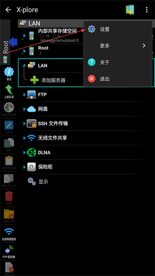 2、在展開的菜單中,點擊設(shè)置選項,進(jìn)入X-plore的設(shè)置頁面。