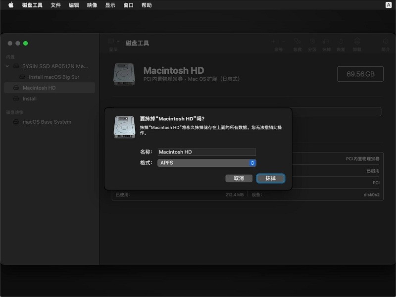 4、選擇磁盤工具,抹掉原有磁盤(默認(rèn)名稱:Macintosh HD,格式:APFS)即可全新安裝