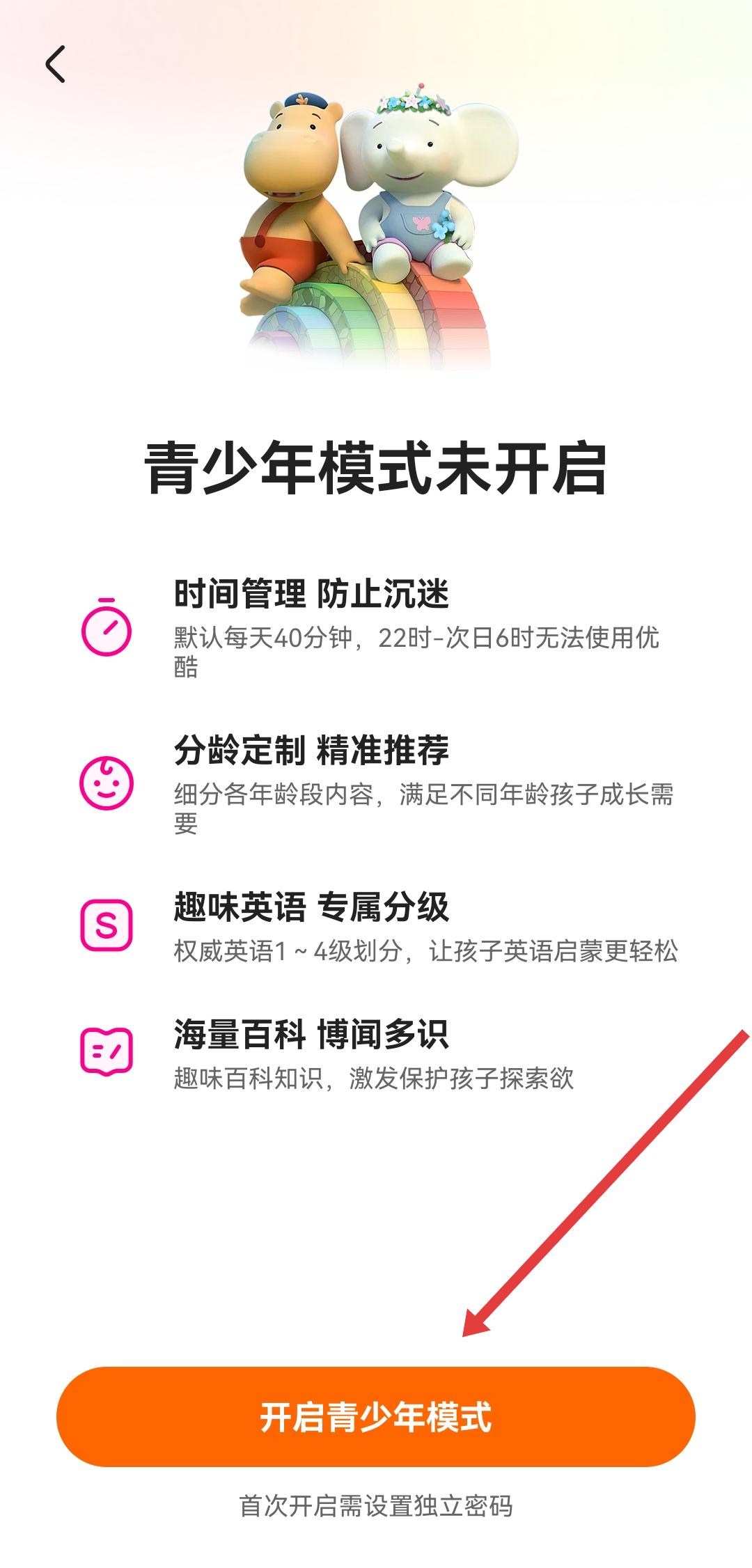 3、在青少年模式頁面,點(diǎn)擊下方的開啟青少年模式按鈕,之后按照提示設(shè)置獨(dú)立密碼,即可成功開啟青少年模式。