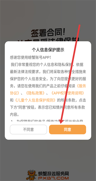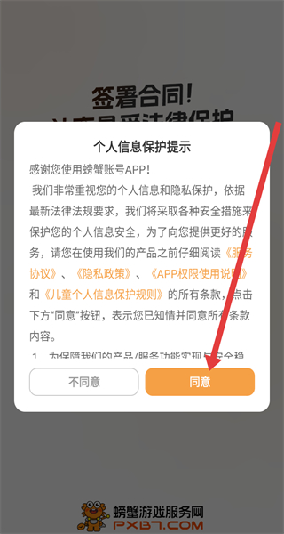 1、在螃蟹賬號(hào)APP的“個(gè)人信息保護(hù)提示”彈窗點(diǎn)擊“同意”,進(jìn)入主界面。
