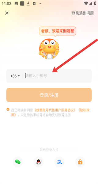 3、在登錄頁面輸入手機(jī)號(hào)碼,點(diǎn)擊“登錄/注冊(cè)”。