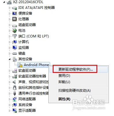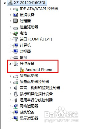 右鍵點(diǎn)擊我的電腦,選擇【管理】,然后點(diǎn)擊左側(cè)的【設(shè)備管理器】,(有的電腦可能點(diǎn)擊我的電腦后就直接有設(shè)備管理器,直接選擇設(shè)備管理器就可以了。)會看到有【Android Phone】一項(xiàng)上有感嘆號,這個(gè)就是我們的手機(jī)設(shè)備。如下圖