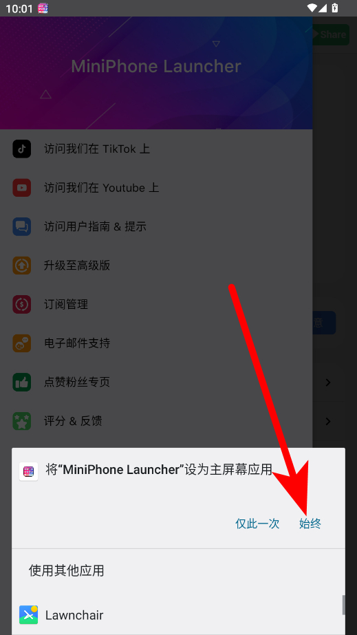 4、在彈出的設(shè)置默認(rèn)啟動(dòng)器的選擇框里,點(diǎn)擊始終選項(xiàng),即可將蘋(píng)果桌面啟動(dòng)器設(shè)置為默認(rèn)啟動(dòng)器。