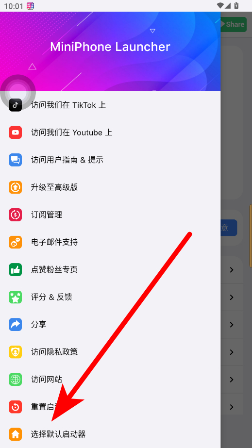 3、在彈出的菜單界面中,向下滑動(dòng)找到并點(diǎn)擊選擇默認(rèn)啟動(dòng)器選項(xiàng)。